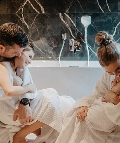 - Alle Zimmer und Suiten sind ausgestattet mit Digital Flat-TV, Telefon, kostenlosem WLAN, Zimmersafe, Kosmetikspiegel, Föhn, Bademantel (auch für Kinder), Bade- und Saunatüchern und Badeschuhe.